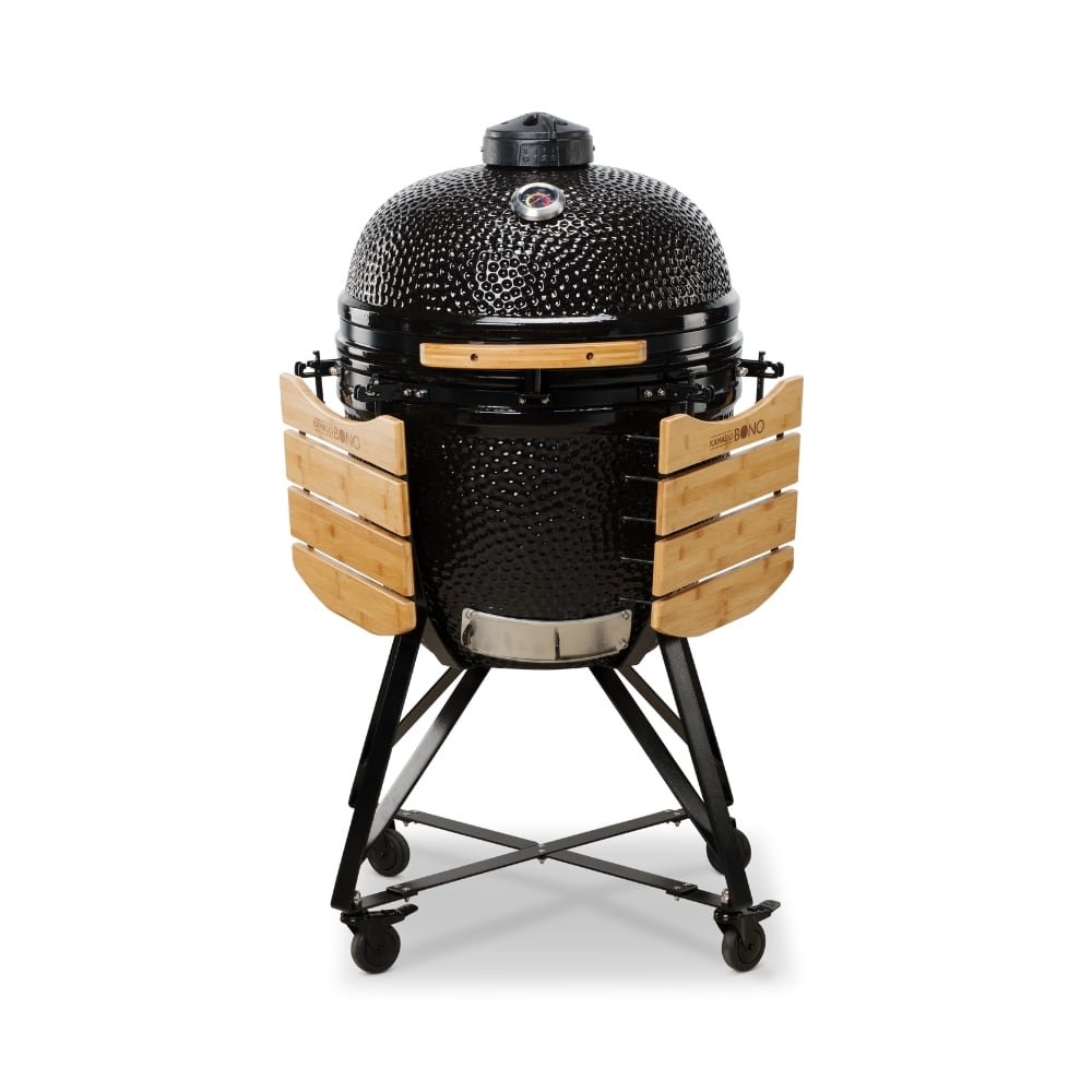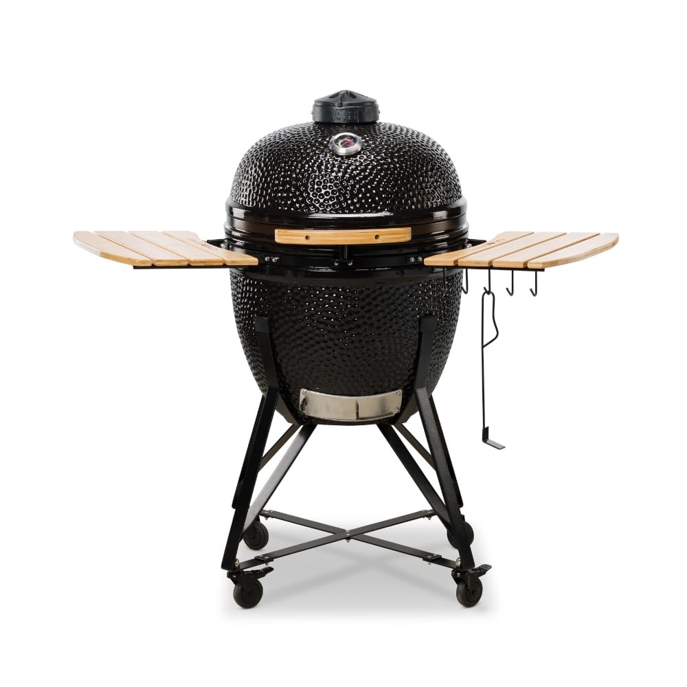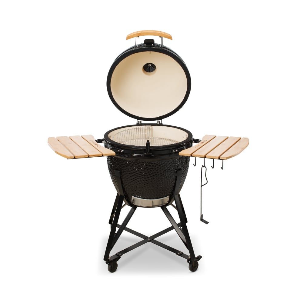 Un modello popolare di grandi dimensioni, progettato per gruppi numerosi di persone (10 o più) Ideale per ristoranti e bar. Ha un carello in acciaio antiruggine, 2 ripiani laterali in legno duro, sfiato superiore completamente apribile, guarnizione in fibra di vetro, sistema di cottura a 2 zone, deflettore di calore in ceramica, coperchio della griglia, strumenti per il carbone, paletta raccogli cenere, supporto per il pollo, termometro, libro di ricette.