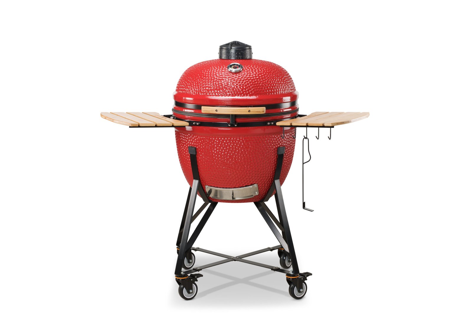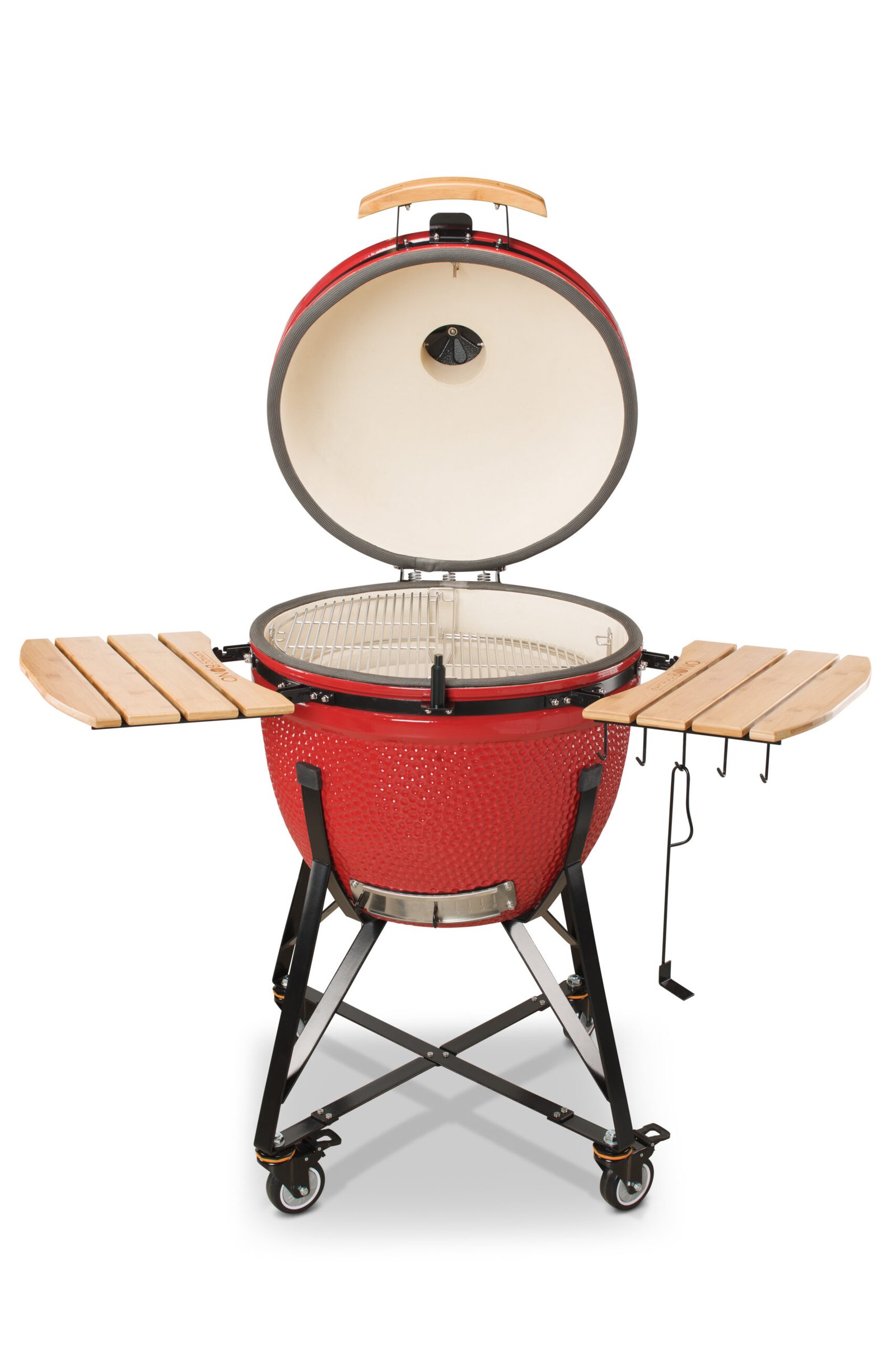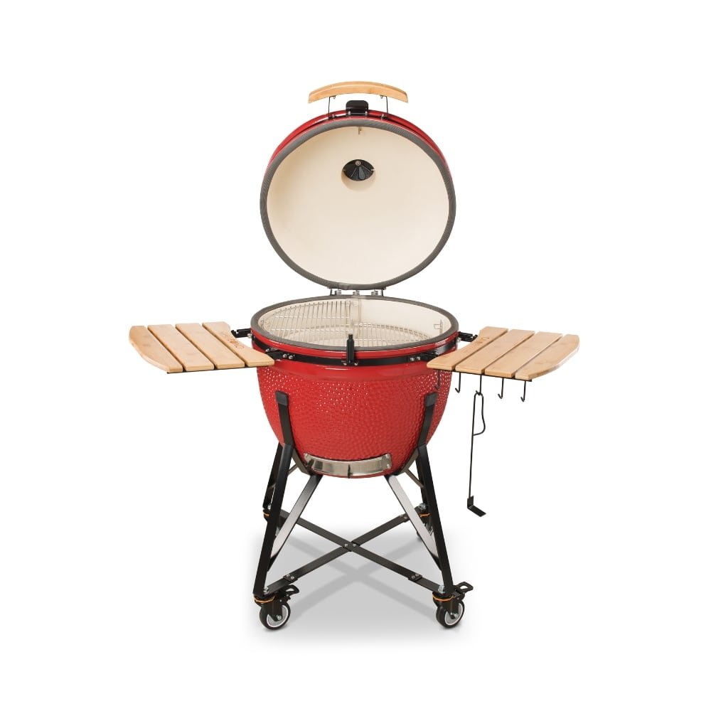 Il modello più grande, perfetto per uso professionale in ristoranti e bar, o per grandi gruppi di persone (15 o più).Ha un carello in acciaio antiruggine,2 ripiani laterali in legno duro, sfiato superiore completamente apribile, guarnizione in fibra di vetro, sistema a due zone, deflettore di calore in ceramica, coperchio della griglia, strumenti per carbone, paletta raccogli cenere, supporto per il pollo, termometro, libro di ricette.