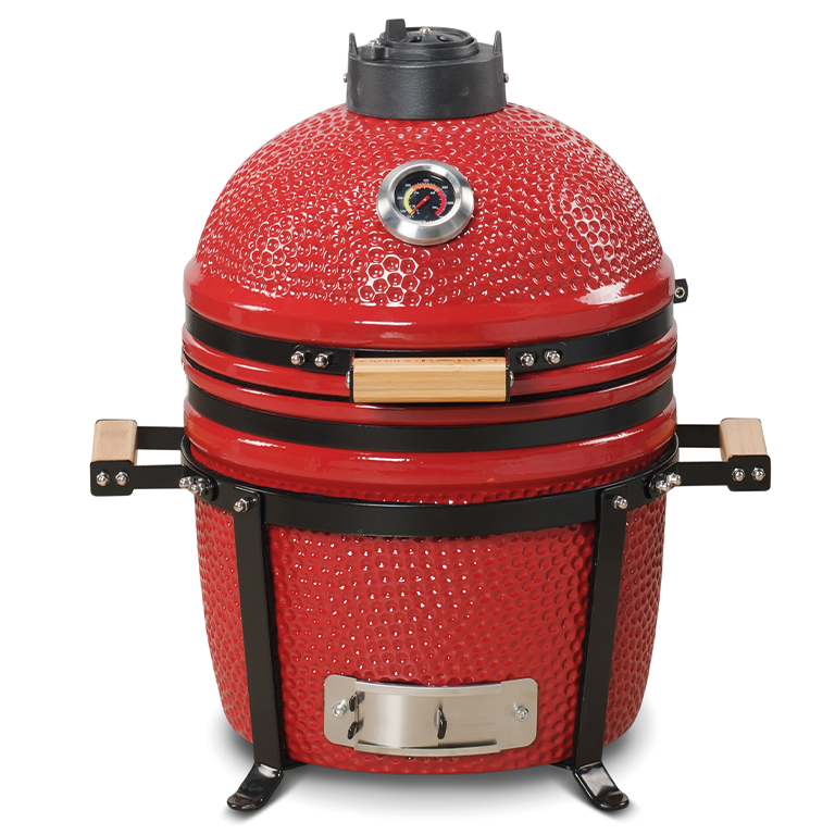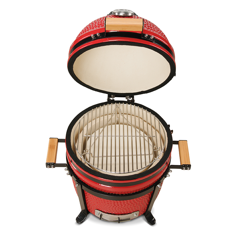Un modello compatto e consigliato per gruppi di persone più piccoli, ideale per il campeggio o piccole terazze. Ha un supporto in acciaio antiruggine, guarnizione in fibra di vetro, griglia in acciaio inox, deflettore di calore in ceramica, pinza per griglia, srtumenti per carbone, libro di ricette.