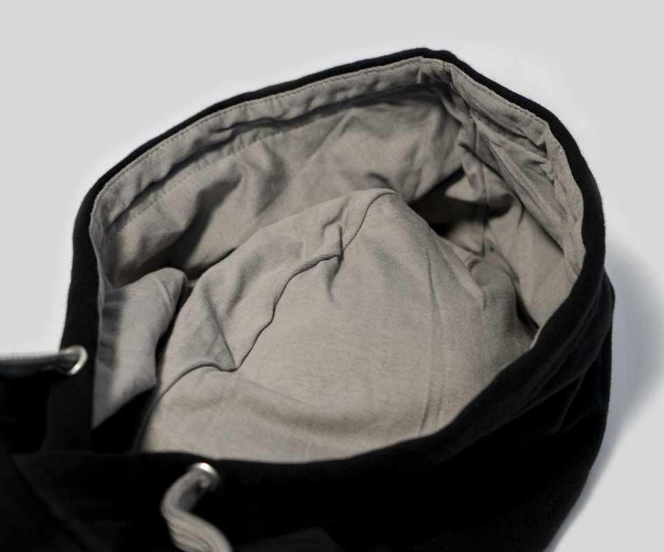 Il colore grigio utilizzato per l’interno del cappuccio e per i lacci contrasta con il nero, per uno stile di carattere e attento al dettaglio.