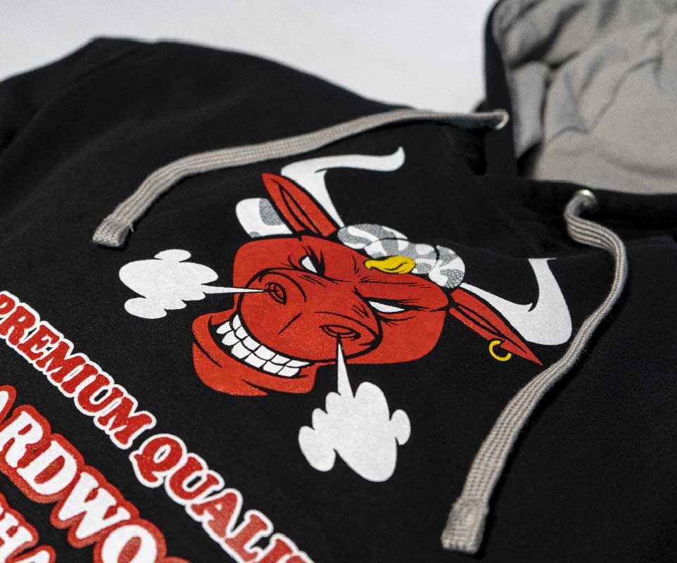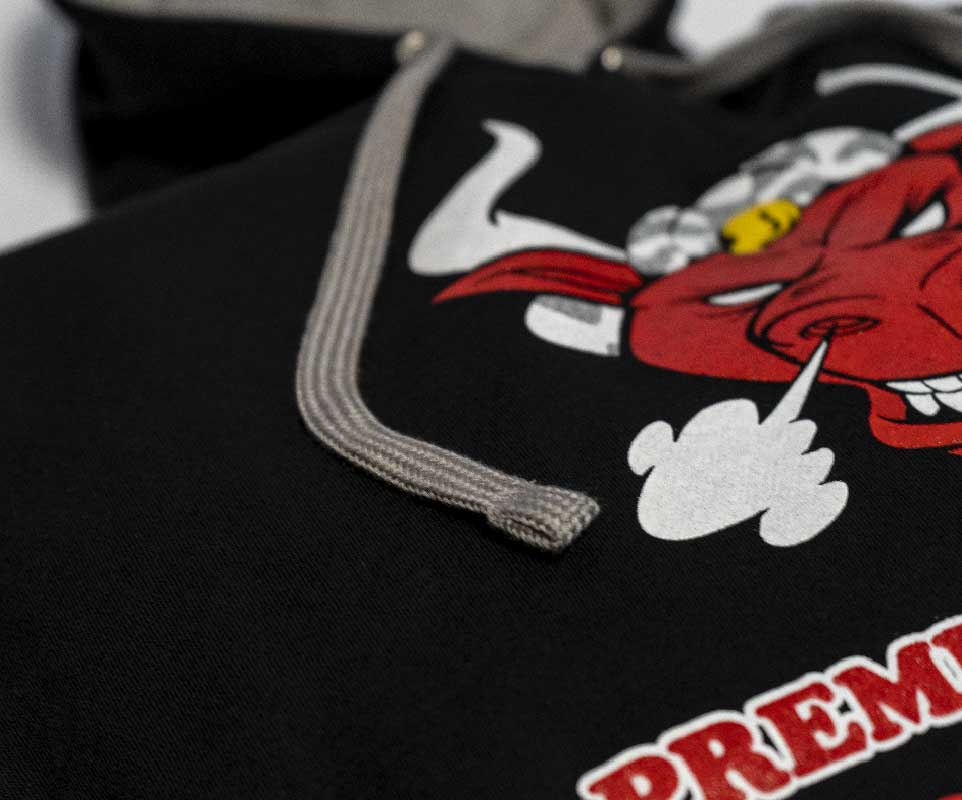 Questa felpa raffigura il logo nella versione Torello, sfacciato ed irriverente. Il carattere deciso della grafica e i colori più chiari dei dettagli a contrasto con la base nera rendono il design accattivante e inconfondibile.