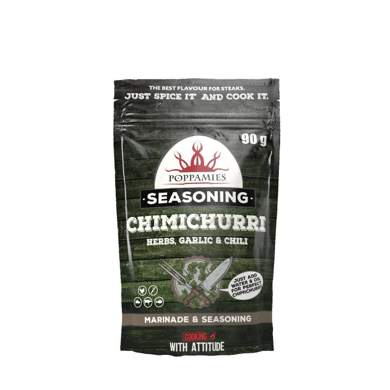 La miscella di spezie per preparare la salsa chimichurri, una salsa di origini argentine con un deciso sapore di prezzemolo e aglio, solitamente servita come contorno per carni alla griglia. Ingredieni: aglio, prezzemolo, sale, peperoncino, origano, foglie di coriandolo, pepe nero, acido citrico.